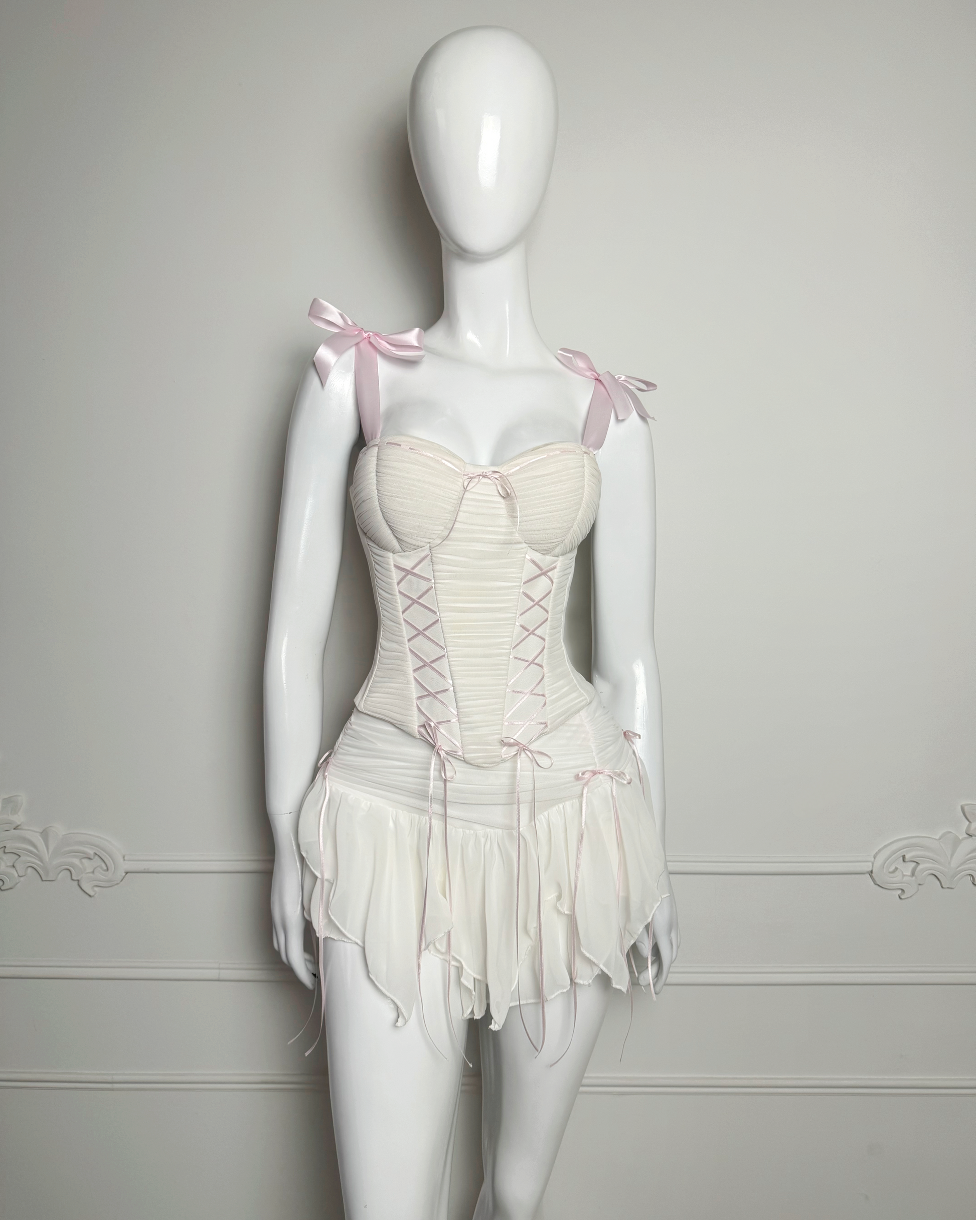 - Sabrina Carpenter: Corset Lucy Blanco + Falda Lucy corta Blanca