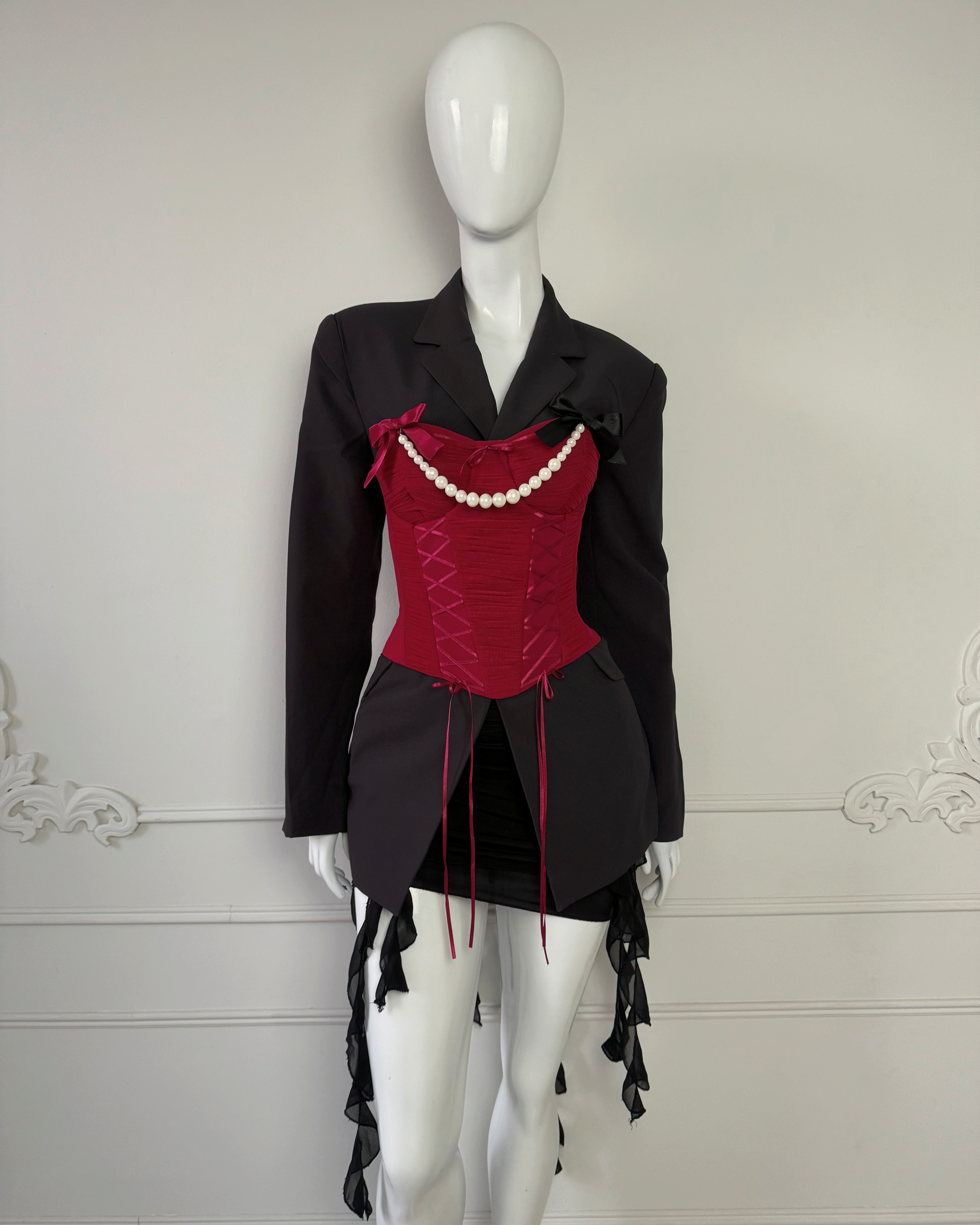 - Enhypen: Corset Lucy Rojo + Falda Tyla Negra + Volantes Negros