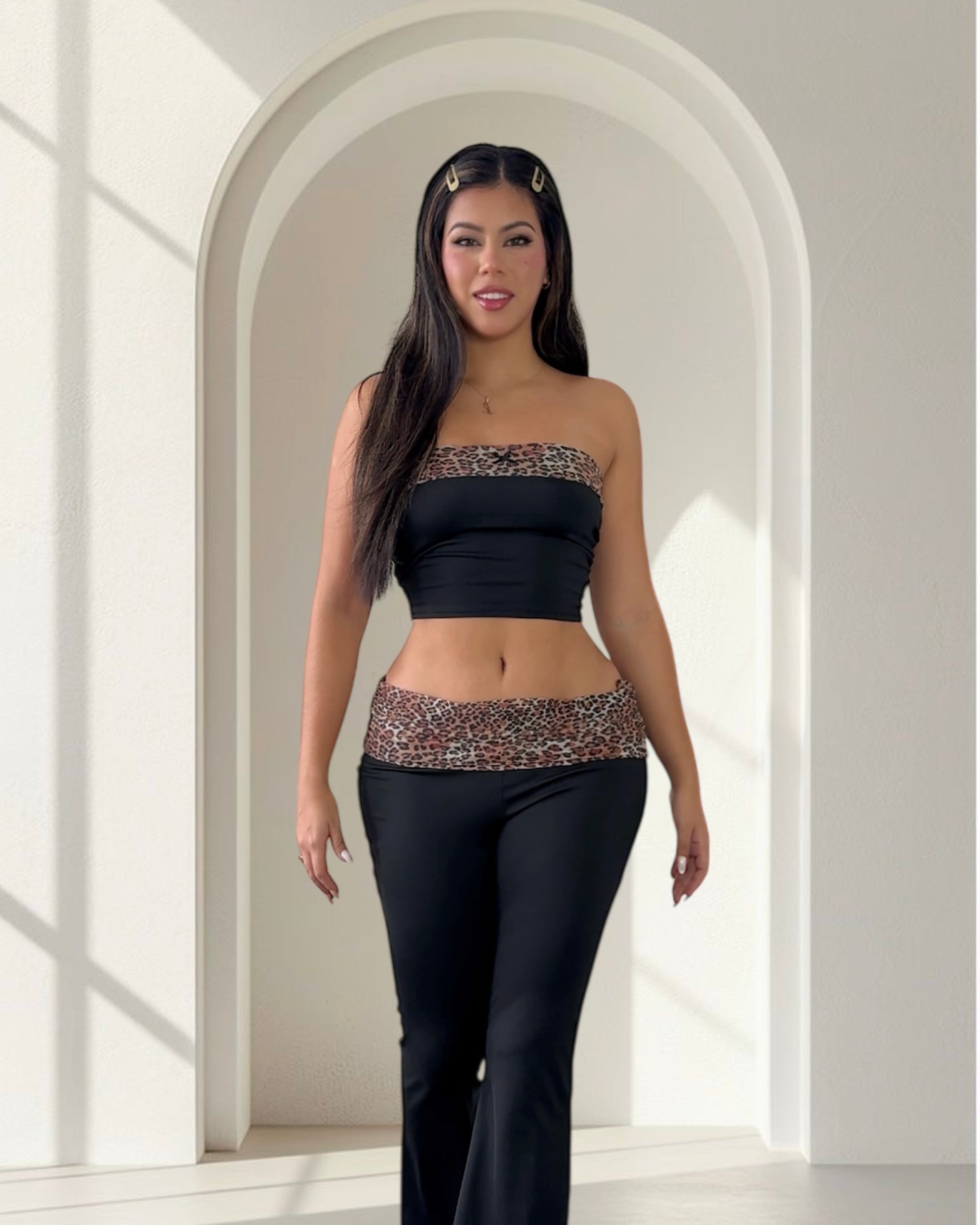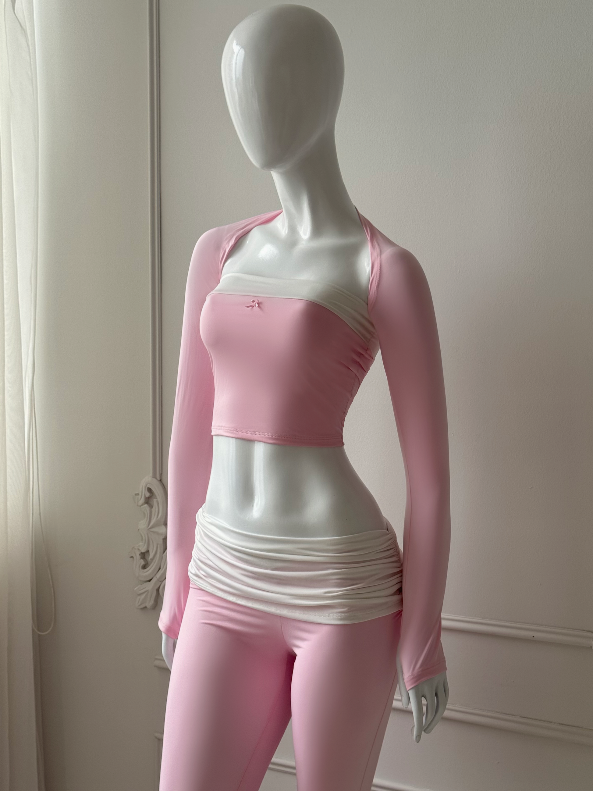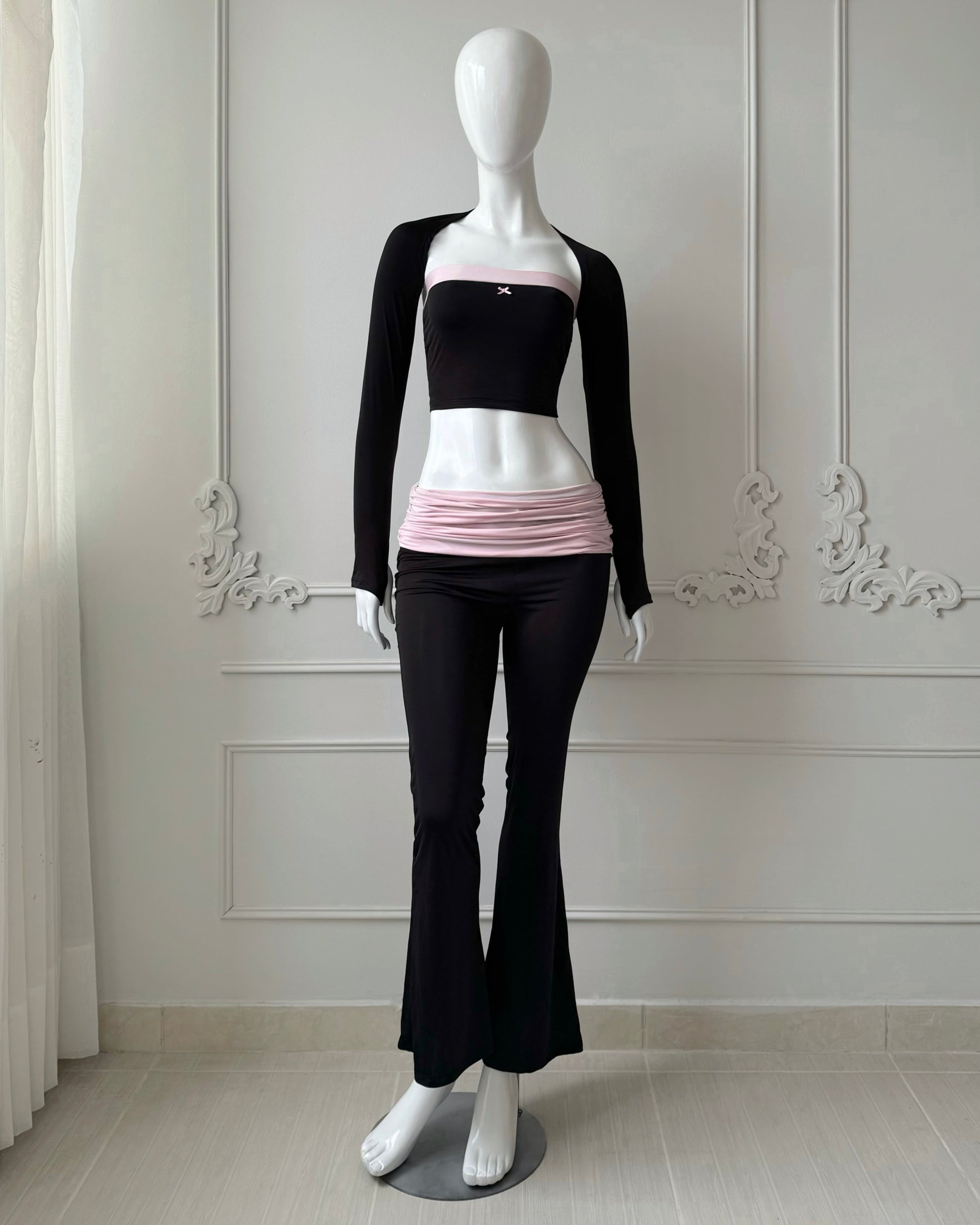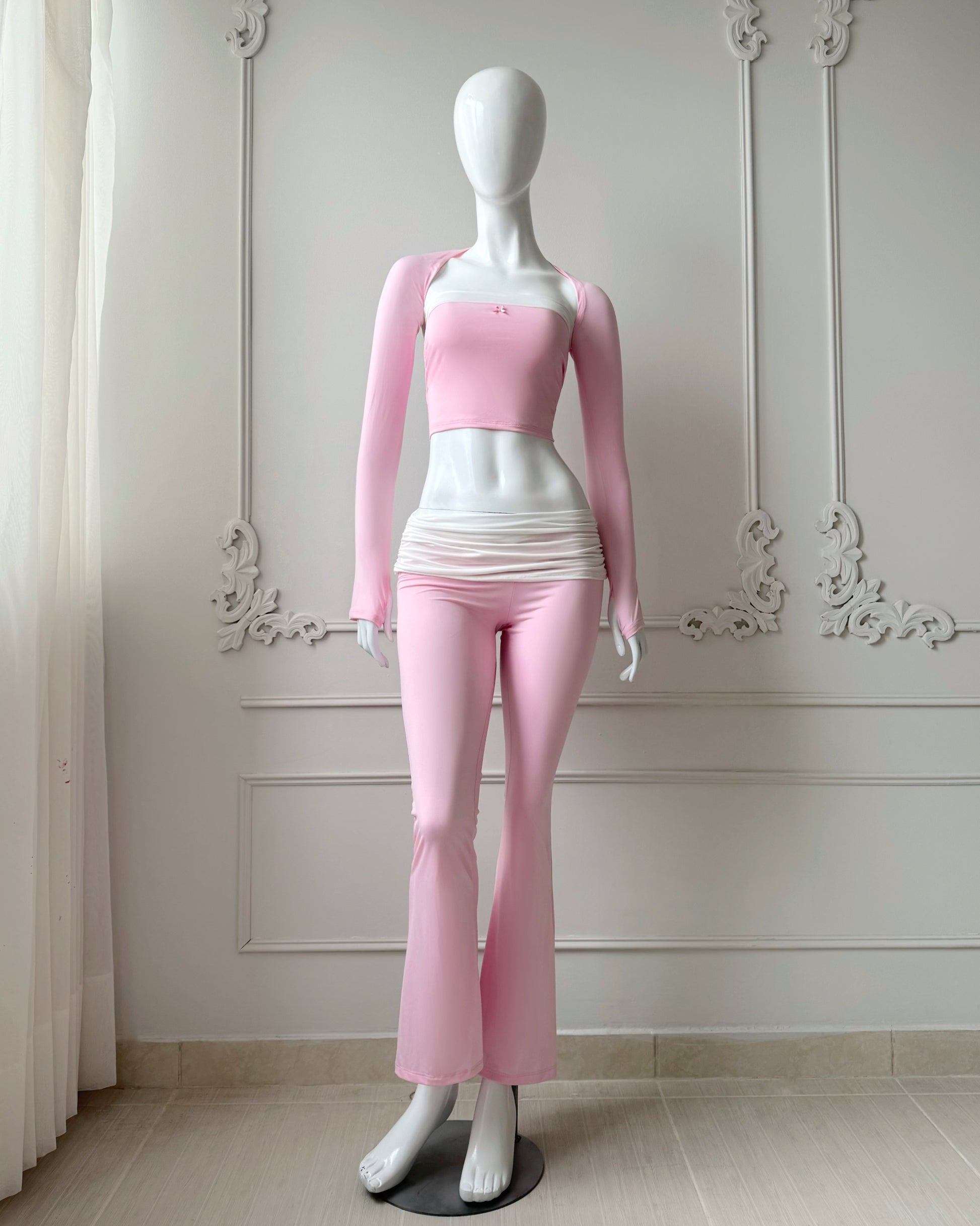 Set de 3 piezas. Bolero con mangas largas tipo guante, top con lazo pequeño y detalle lineal, flare pants con detalle de fruncido en la cadera. Perfecto para hacer pilates, yoga, o simplemente estar cómoda.