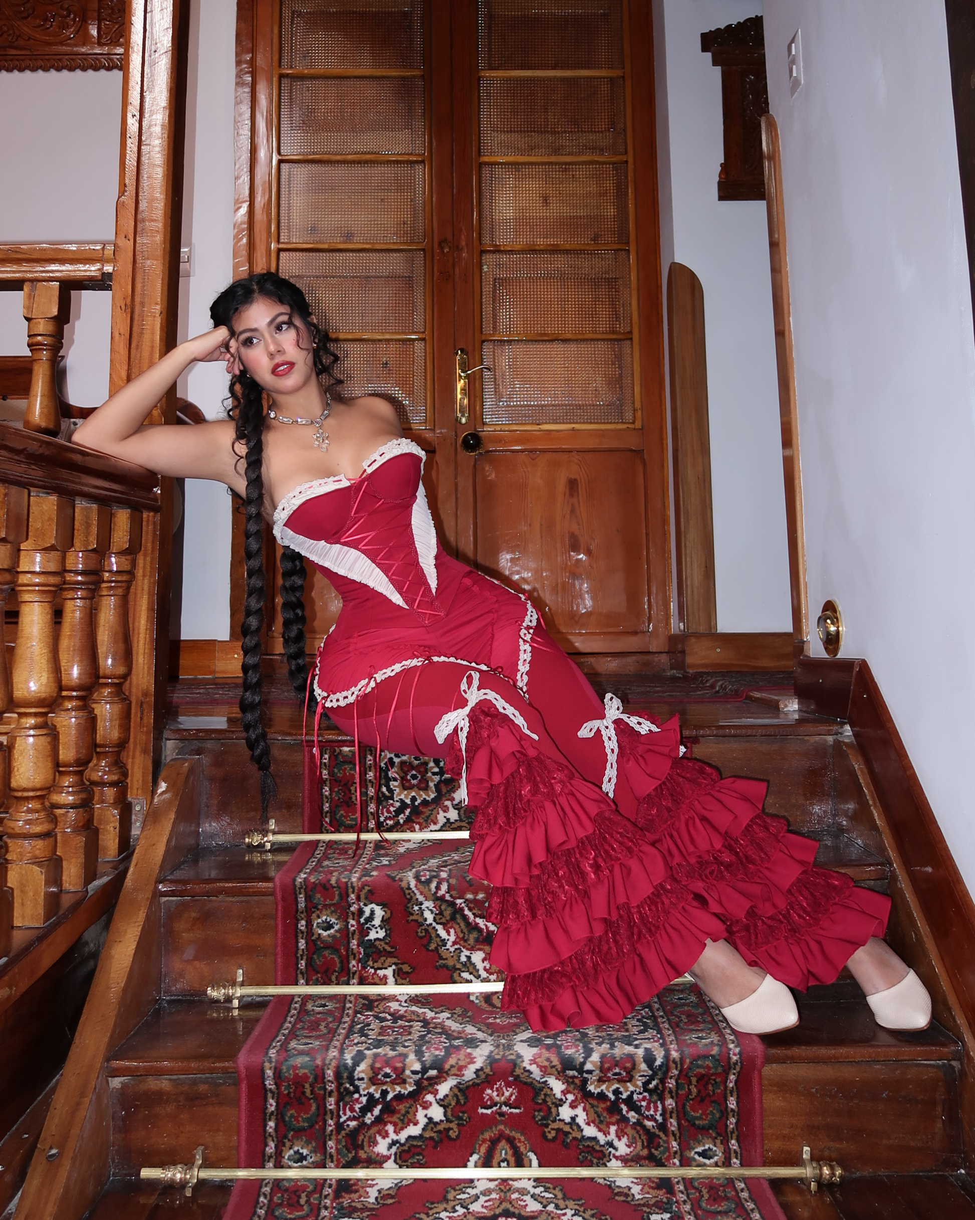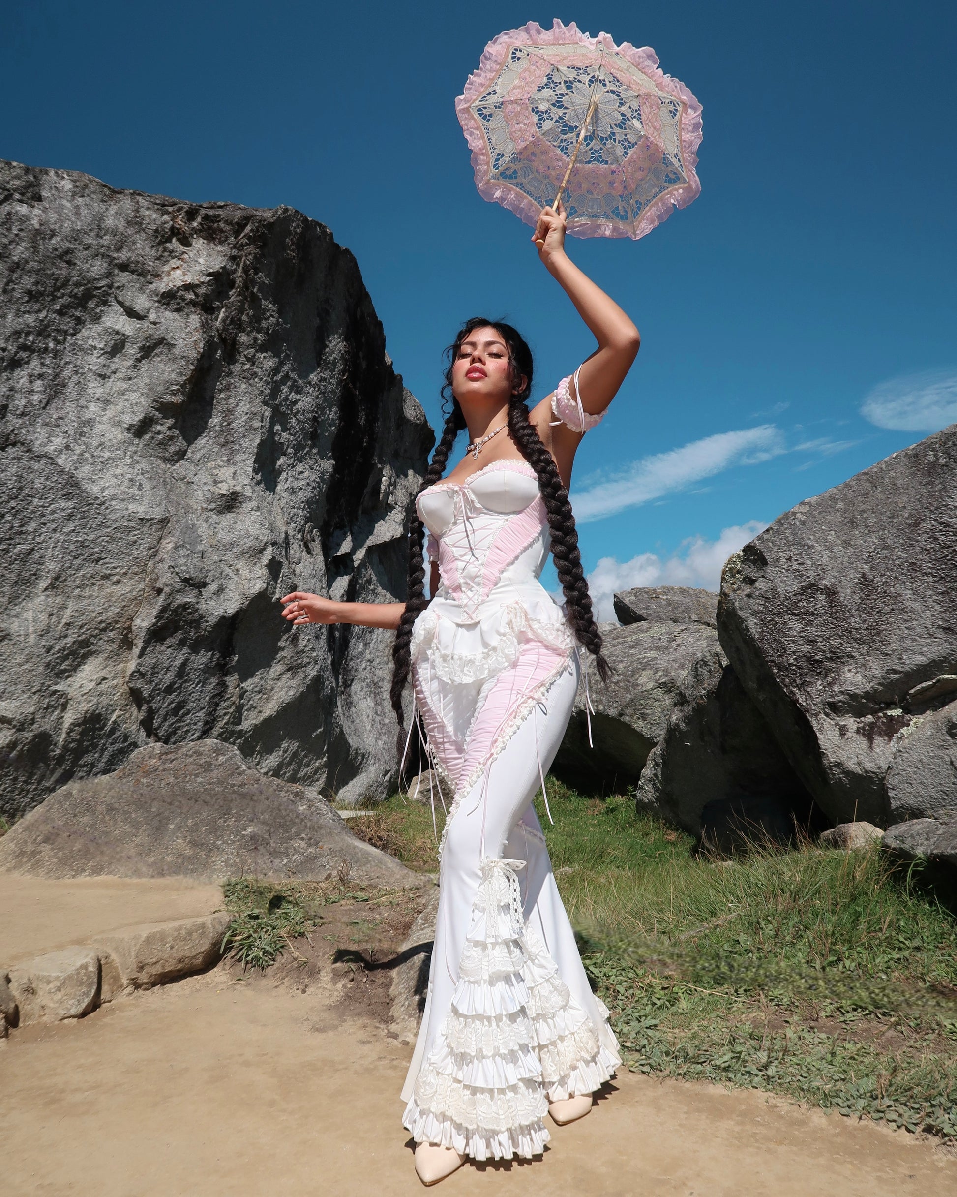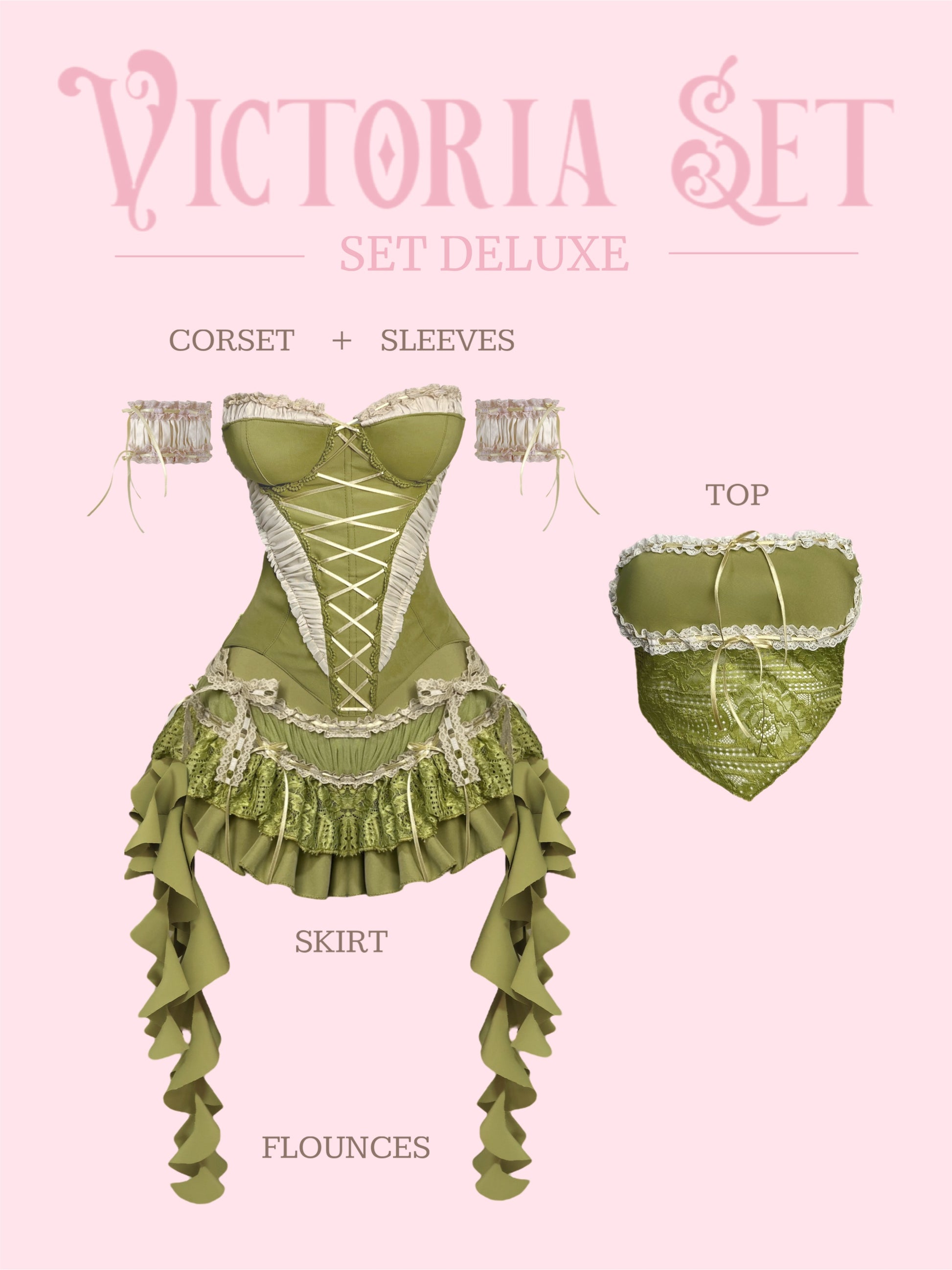 El diseño más maravilloso de todos: Victoria Set! Inspirado en la era victoriana… perfecto para usarse en estas fechas festivas! Consta de 7 piezas: 1. Un corset con entrelazados frontales y copas push up con detalles de fruncidos con grecas, tiene piezas curvilíneas que afinan la cintura y forman un reloj de arena. 2. Un pantalón con fruncidos curvilíneas laterales y frontales que brindan caderas voluminosas, también volantes fruncidos de encaje bajo la rodilla para dar una silueta de sirena. 3. Una falda short con fruncidos, volantes y grecas que tan comodidad y volumen. 4. Volantes que se añaden a la falda para dar mayor volumen a tus caderas. 5. Una sobre-falda que se regula con cintas y puede usarse encima del pantalón y falda, para dar más volumen y autenticidad. 6. Mangas off shoulders fruncidas. Y 7. Un top de encaje.